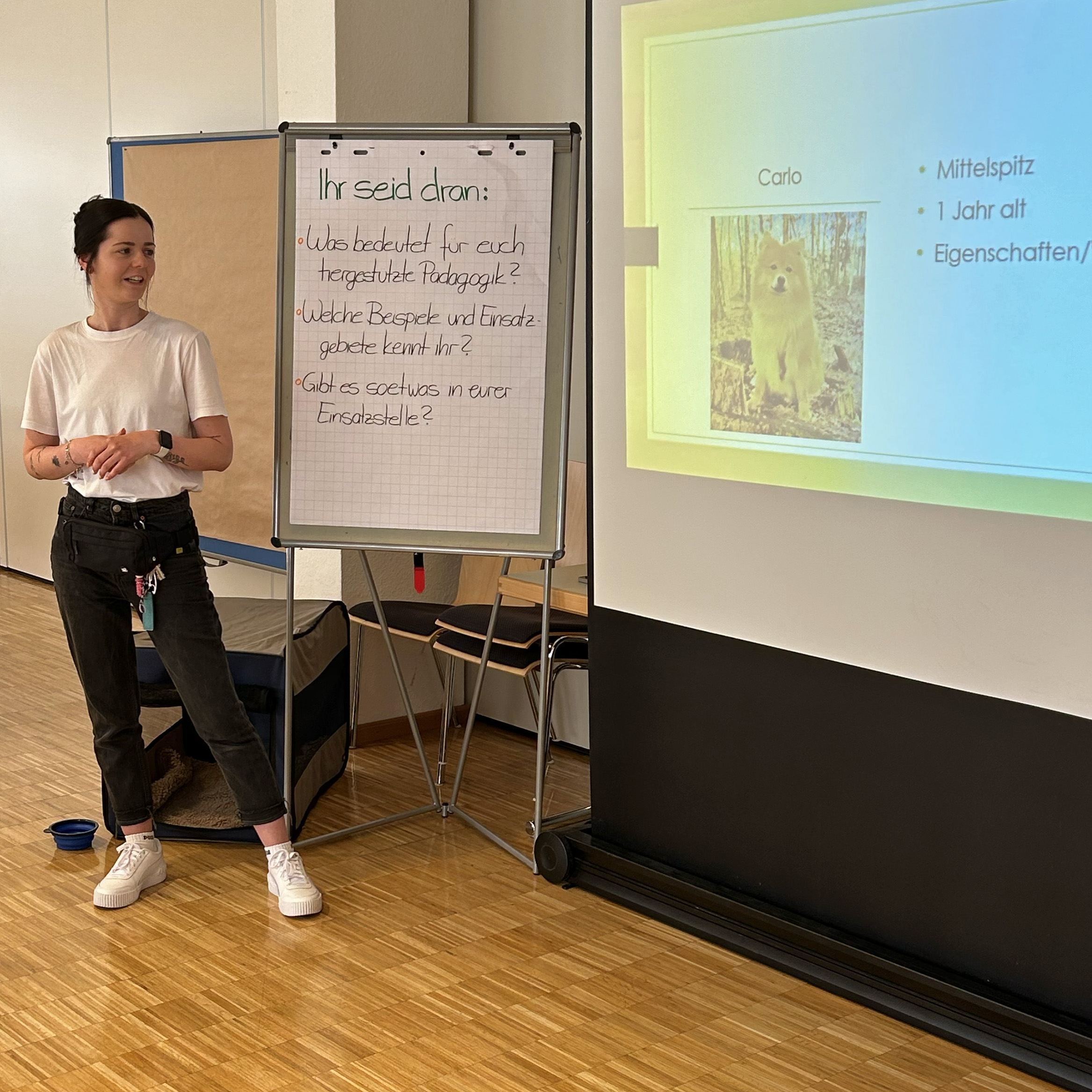 04.06.24 - Vanessa Kühling, pädagogische Mitarbeiterin bei der Jugendhilfe Collstede, hat bei einem Seminar des Freiwilligendienstes einen Vortrag über tiergestützte Therapie gehalten. An ihrer Seite war ihr treuer Begleiter Carlo, der derzeit zum Therapiehund ausgebildet wird.